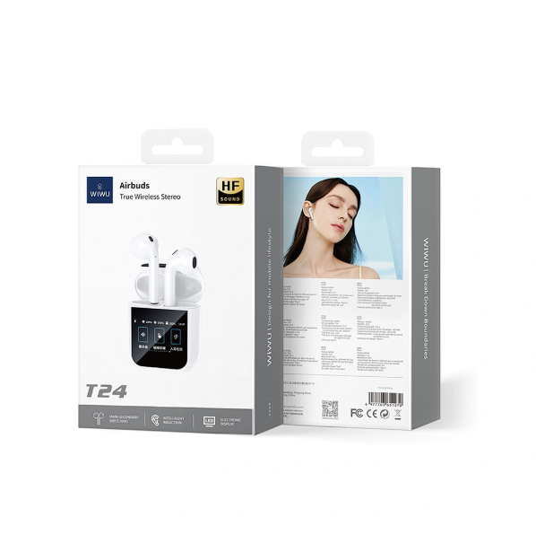 WiWU T24 combines practical design and powerful performance. Featuring Bluetooth 5.4, a display screen, in-ear detection, and 4.5 hours of music playback, these TWS earbuds are perfect for daily use. Compact 300mAh case and USB-C cable included.
