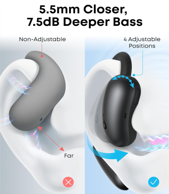 - Close to the Ear Canal for 2x Deeper Bass: Adjustable ear hooks bring the sound closer, doubling the bass output of non-adjustable buds. A maximum boost of 7.5dB delivers richer, more powerful beats. Note: Data from the soundcore lab.