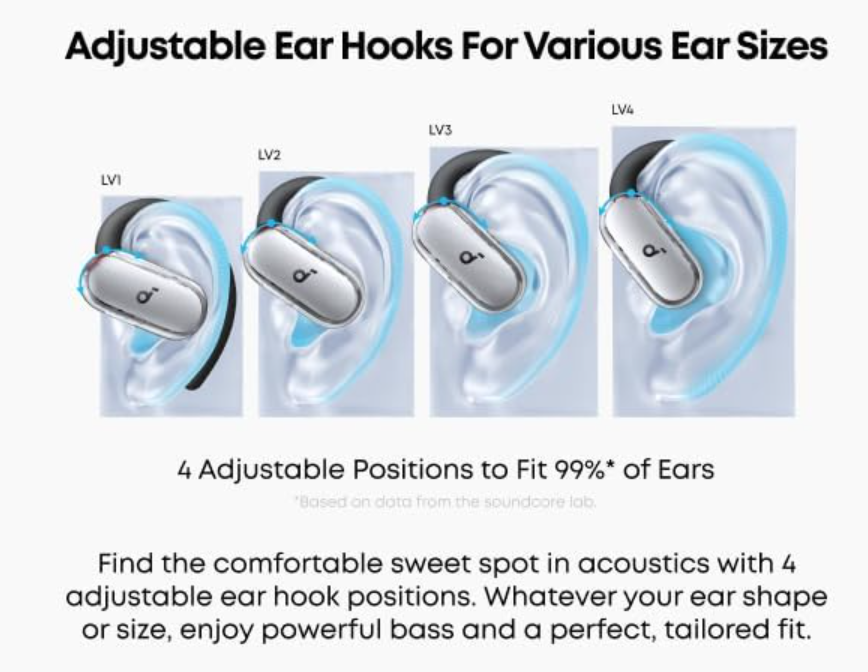 - A Perfect Fit for Every Ear: SoundCore's innovative 4-level adjustable ear hooks enable a comfortable fit tailored to over 99% of ear shapes and sizes.